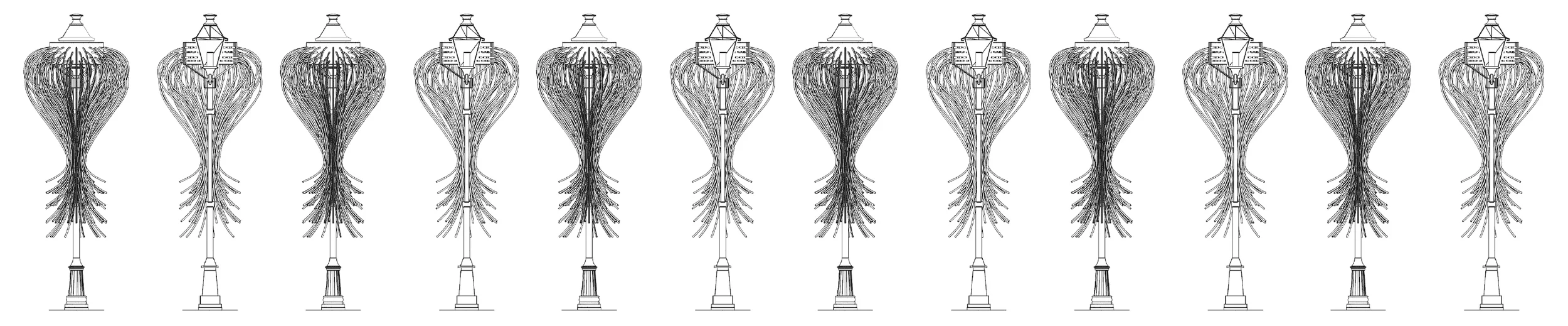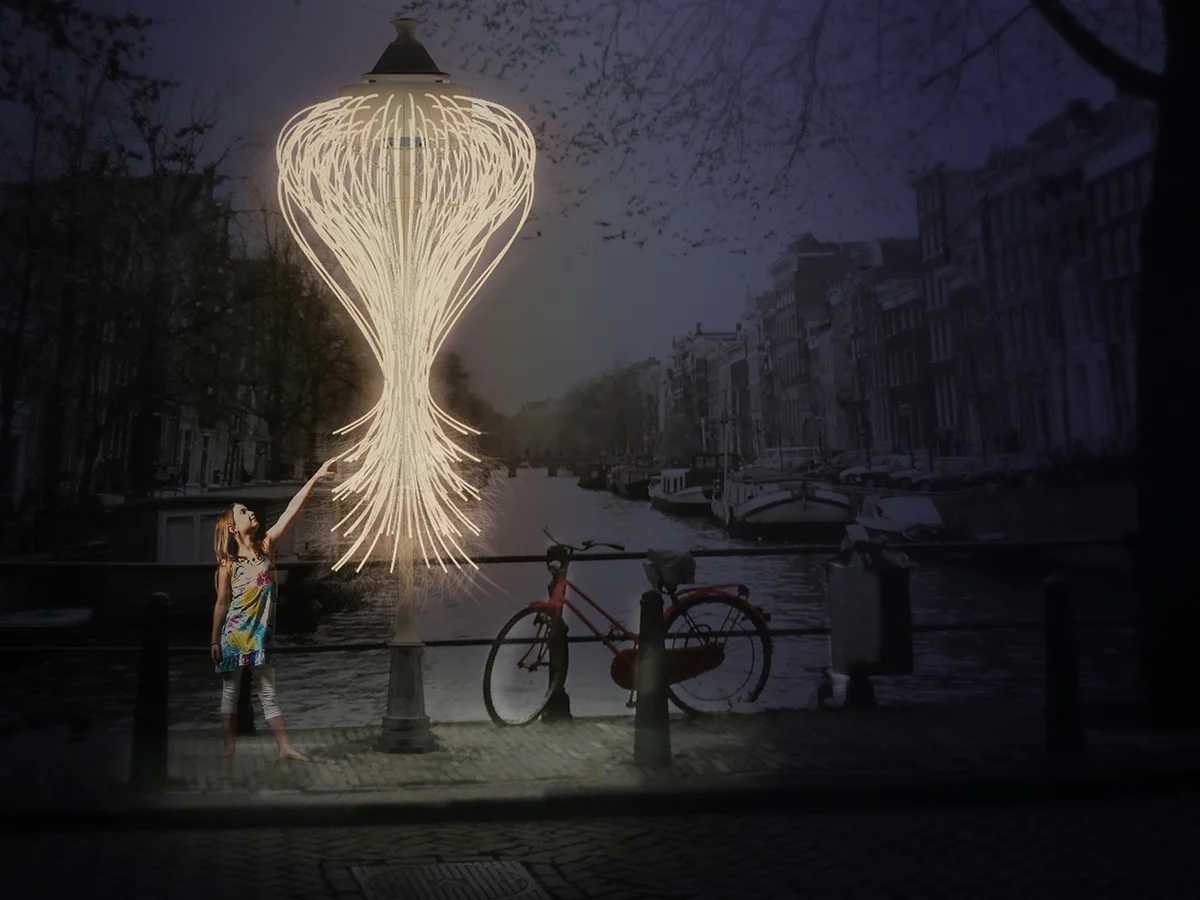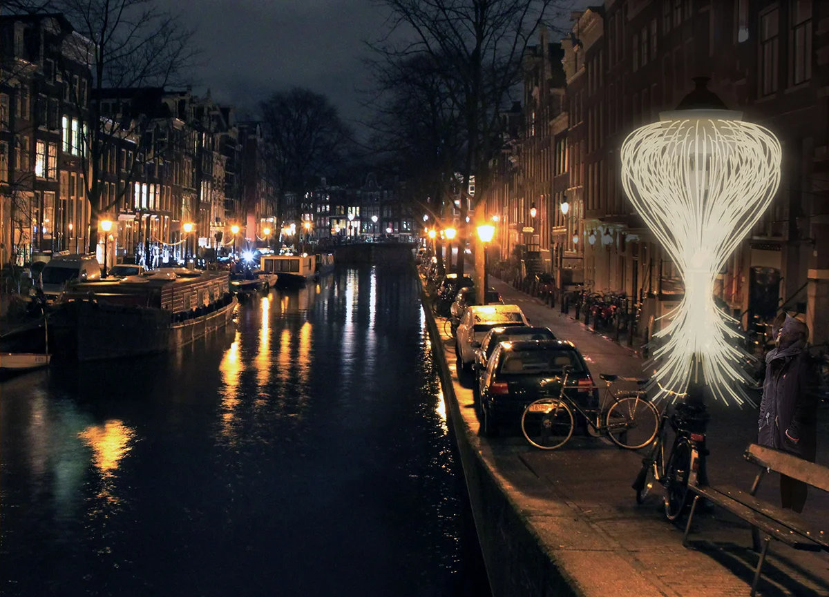 One common element every European city shares is a pervasive unifying light based infrastructure. The modern day street lamp delicately traces the urban network of paths, avenues, and canals, injecting life in the absence of daylight. The street lamp composes the darkened cityscape and reveals the urban veins that shape Amsterdam’s unique identity. Between 1660 and 1700 nearly every city in Europe implemented street lamps and within a 40 year period Europe shared this amazing connective element which provided safety and additional layers of character to the European streetscape. Our proposal seeks to leverage Amsterdam’s existing urban light infrastructure, harnessing it’s presence in an unexpected way as a means to reimagine our collective relationship to public space illumination. We propose that the ubiquitous light of the urban streetlamp be allowed to escape its enclosure and take physical form thus providing an armature for social interaction.