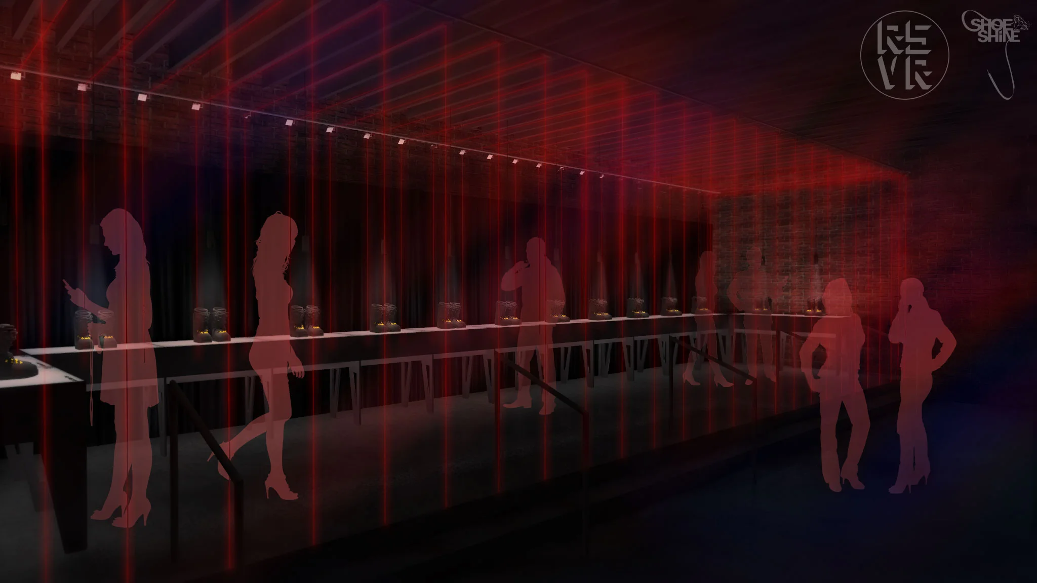 The exhibit accomplished this by forming three unique ways to engage the audience: inform, embrace and romance the viewer. Below the venue’s mezzanine, a projected animation provided event title and sponsor information. Further into the space laser diodes in series formed a permeable tunnel that encapsulated a 36 ft long custom light table and pendant lights showcasing the artist’s work in an intimate setting.