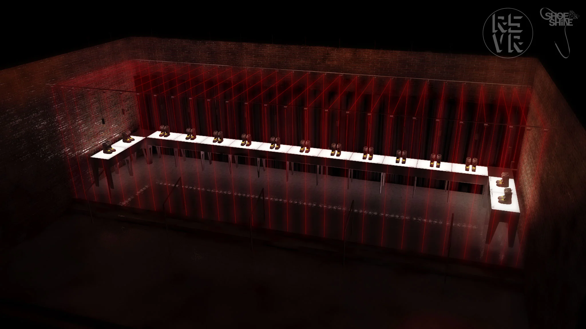 The Shoe Shine event, hosted by NIKE during the 2012 SIA Festival, showcased 14 pairs of Zoom Force One snowboarding boots modified by artists to embody a unique futuristic theme. The exhibit sought to form a visual as well as spatial relationship with the pieces while enhancing the artwork.