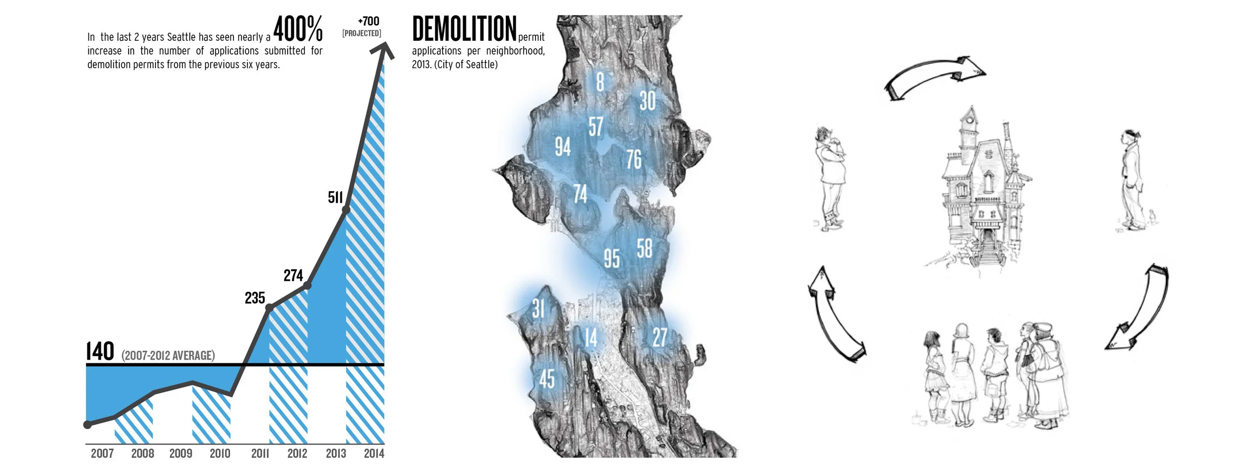 The Seattle Demo Project temporarily liberates these buildings from their original functions to become an effective medium. Fostering a dialogue between architects, artists, builders, owners, and the public.