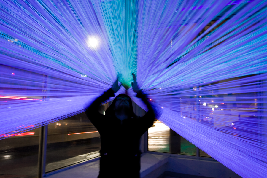 Tacoma Array is a site specific installation that explores the notion of implied space with the use of light as a medium. Through a constant density of contrasting light reactive string, Tacoma Array slices through the small storefront space and bathes its surrounding environment with soft green and violet light. The resulting planes embrace each other elegantly while engaging the viewer in the implied space above, below and in between.